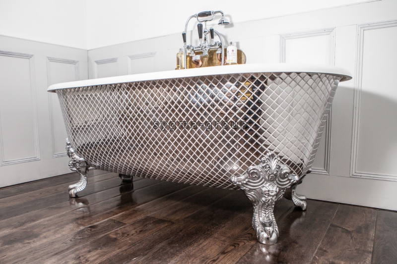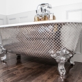 La photo illustre parfaitement comment le carrelage mosaïque inox miroir peut transformer un simple élément de la salle de bain en une véritable œuvre d’art. Ici, une baignoire sur pieds classique a été entièrement revêtue de ce carrelage brillant, apportant un contraste saisissant entre le style ancien de la baignoire et la modernité de l’inox miroir. Les petites tuiles carrées de la mosaïque forment un maillage précis, ajoutant de la texture à la surface tout en offrant un effet de miroir saisissant.
