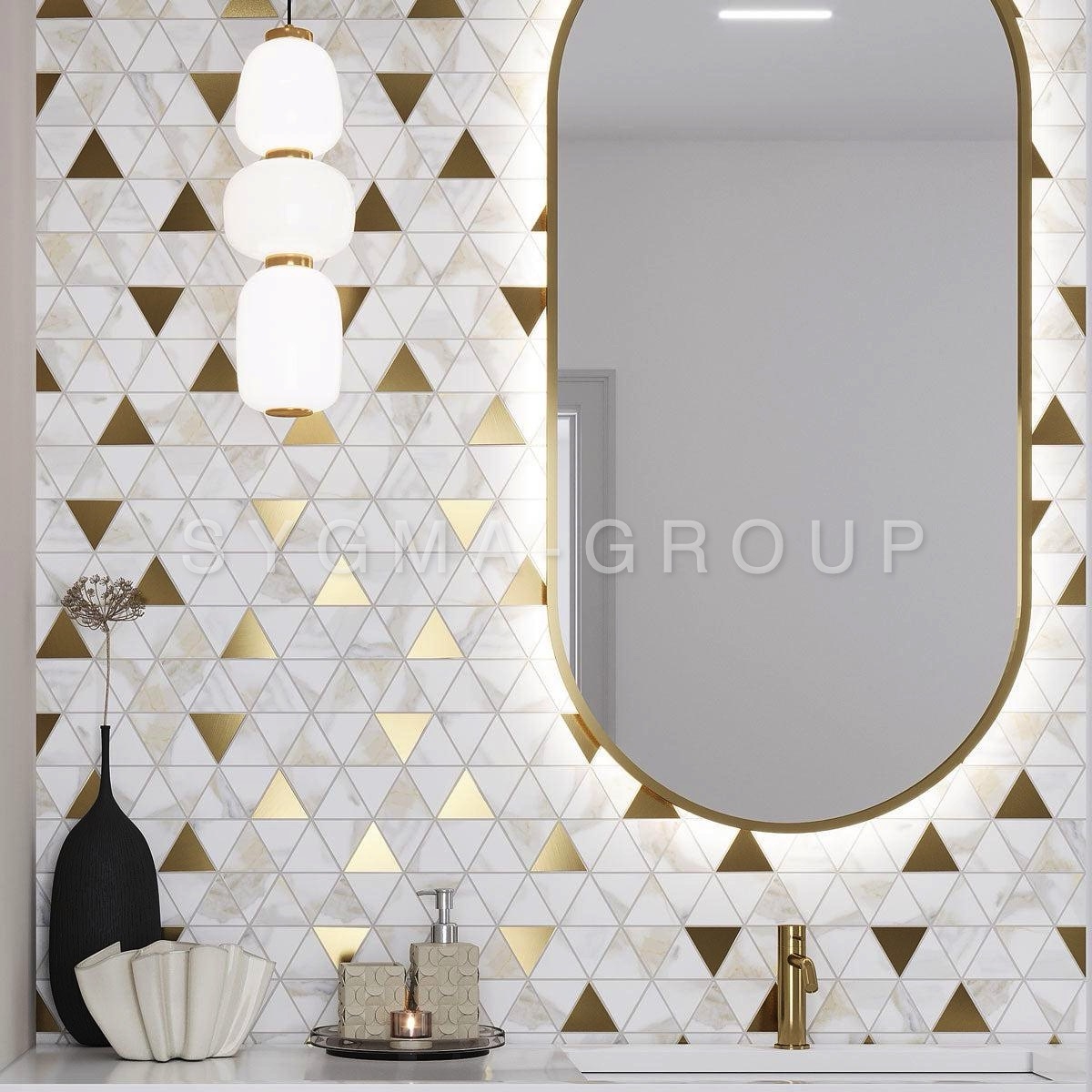 Le carrelage mosaïque triangulaire or et blanc est un véritable caméléon du design d'intérieur. Que vous ayez un projet de salle de bain moderne, une cuisine contemporaine, ou une douche italienne à rénover, il s'adapte à toutes les envies et tous les styles. Vous pouvez l’utiliser pour créer un mur d’accent qui captivera tous les regards ou pour habiller subtilement un espace grâce à ses couleurs élégantes et son motif sophistiqué.
