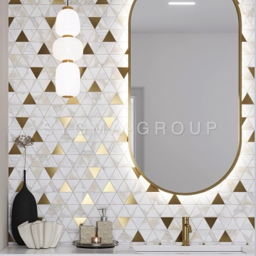 L’un des grands avantages de ce carrelage mosaïque réside dans son design géométrique. Les triangles dorés, finement découpés et parfaitement alignés, créent un motif visuellement stimulant qui capte immédiatement l’attention. Ce type de motif est très en vogue dans la décoration d'intérieur contemporaine, car il apporte à la fois un côté artistique et une structure équilibrée à l'espace. Ce carrelage est également idéal pour jouer avec les perspectives et les dimensions des pièces. En fonction de l’angle de vue et de l’éclairage, les motifs triangulaires dorés peuvent créer des effets visuels différents, allant d'une subtile brillance à un éclat doré plus prononcé. Le blanc, quant à lui, apporte de la clarté et met en valeur le contraste élégant avec l’or.